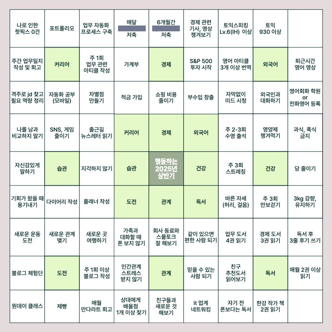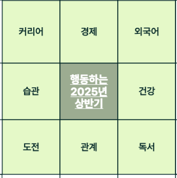 - 커리어, 경제, 외국어, 습관, 건강, 도전, 관계, 독서